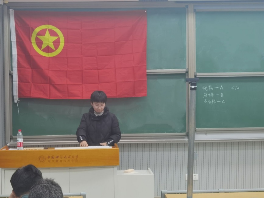 在团旗的见证下,尹书记向同学们发放了团员教育评议表,并介绍了几位申请优秀团员的同学的基本情况以及本次评议的评分规则。在公平公正公开的氛围下同学们进行了谨慎而全面的思考,并给每一位团员同志庄严地打出了自己心中对方应得的分数。在同学们评分完毕后,团支书收集了每一位同学的评议表并统计唱票,最终评选出了12名优秀团员及团干部候选人。
