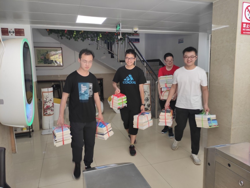 受捐赠班级的同学也非常积极地参与这次艰巨的跨越校区 “搬书之行”。交接当天,艳阳高照,豆大的汗珠也抵挡不住同学们搬书的热情。在此之前,考虑到中校区与西校区的距离,搬运这一千多本书仅靠人力太费时费力,因此同学们租下了一辆小三轮车,并多次运输这些仅仅靠人力从五六楼搬运到一楼的书籍。尽管有了小三轮车的助力,但是还是花费了一个多小时,同学们才把一千多本书籍搬运到中区五号楼与六号楼的二层休息区。经过一个多小时的劳动,同学们在休息区中停下了脚步下,空调的凉风徐徐吹来,此刻同学们深刻感受到劳动后的惬意舒适,放松了学习中紧张的心情,收获了劳动过程与同学们交流的乐趣。