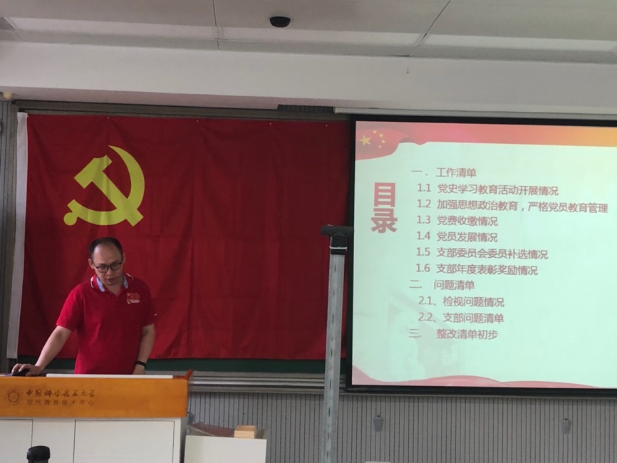 之后是党史学习教育专题组织生活会,组织生活会由严炜主持。组织生活会的流程为:一是支部书记代表支部委员会向党员大会述职;二是党员对党支部的工作进行评议;三是党员逐一发言,讲收获提高,讲差距不足,开展自我批评和批评;四是指导老师对党支部在党史学习教育活动期间的工作进行点评。