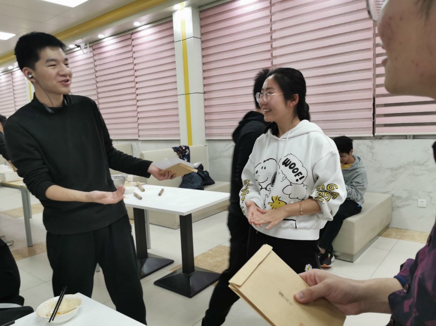 本次活动紧接冬至包饺子活动进行,在享用美味的饺子后,同学们坐在一起,由组织委员王少涵轮流抽取同学们去年写下的愿望进行公开阅读,在完成去年的愿望的同学中,再抽取一名同学获得本次活动的奖品。同学们的新年愿望都十分美好,最终,有8名同学完成了去年的新年愿望。