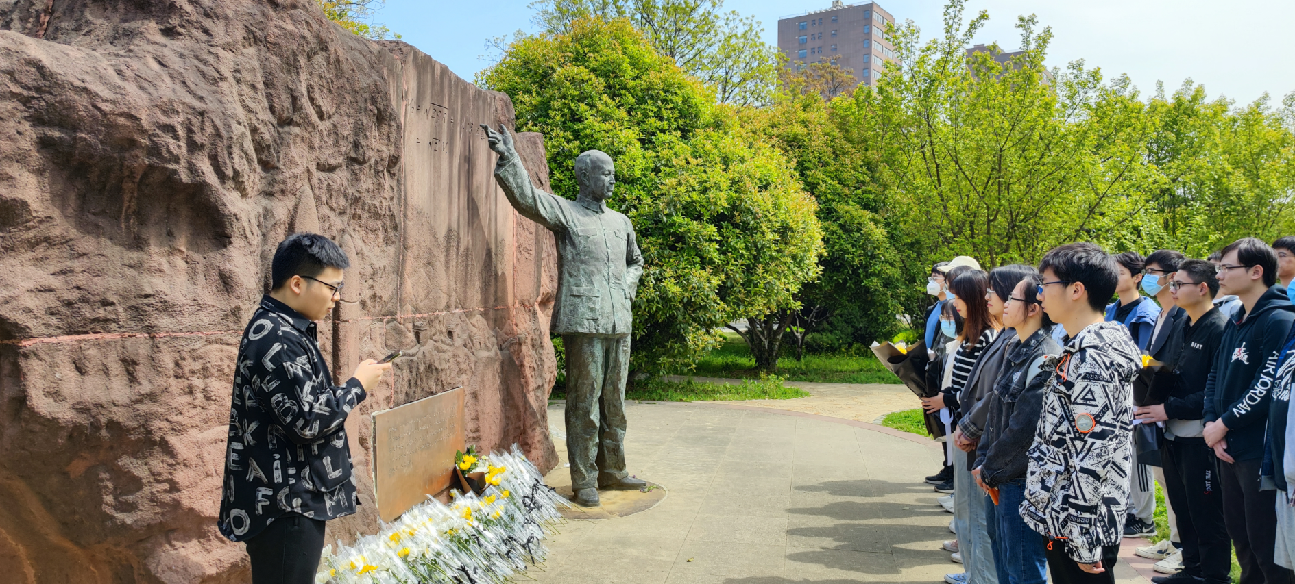 看完电影之后,同学们来到也西湖旁边的钱学森雕像处,表达对钱老的敬仰和怀念之情。组织委员聂亦潇同学通过一段简短的致辞,概括了钱老为祖国奉献的一生,表达了同学们的敬慕之情和向钱老学习的决心。我们要学习和弘扬钱学森伟大的爱国情怀,做又红又专的科大人,为祖国的建设做贡献。致辞完毕,同学们献上鲜花,鞠躬致敬,缅怀先辈。