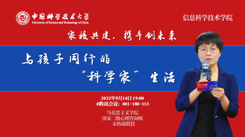 宋怡老师以自己在学校进行教学、心理咨询和班主任工作的经历作为基础,向家长们呈现了几种具有代表性的亲子互动状态,分析了科大学生学业、人际交往等方面的生活状态和可能遇到的挫折压力,并从适应阶段、挫折阶段、上升阶段、选择阶段来跟家长交流如何与孩子互动、如何提供有益的支撑,也跟家长们分享如果发现孩子出现心理问题要如何面对等。