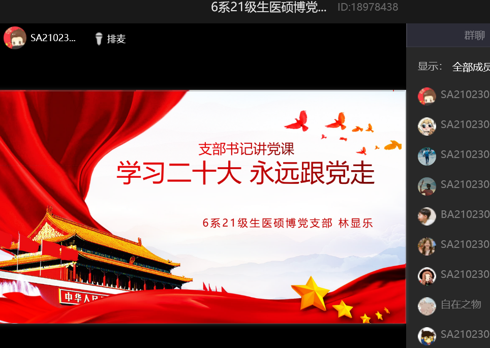 此外,林显乐表示,全面从严治党是党永葆生机活力、走好新的赶考之路的必由之路,身为党员要毫不动摇地坚持党中央的统一领导,切实做到“两个维护”;作为青年党员,更要不断加强政治历练,努力提升站位的高度、信仰的硬度、党性的纯度。在通过文字报道、视频解读等途径学习党的二十大精神外,支部党员还要积极参与学校团委组织的“学习二十大精神”线上知识竞赛,并通过支部群聊交流学习心得。最后,他指出,学习领会党的二十大精神,要贯彻落实到科研实践中去,作为科大学子,要面向世界科技前沿、面向国家重大需求、以国家战略需求为导向,增强自主创新能力,共同推进关键核心技术攻坚战的全面胜利。