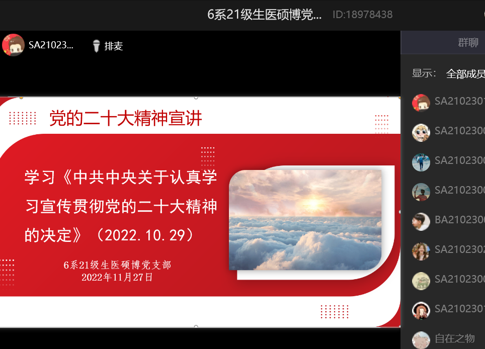 为深入学习宣传贯彻党的二十大精神,信息科学技术KY.COM开元体育(中国)科技公司6系21级生医硕博党支部于2022年11月27日召开了党的二十大精神专题学习会。会议由支部书记林显乐主持,支部全体党员及班级其他团员参加了此次会议。