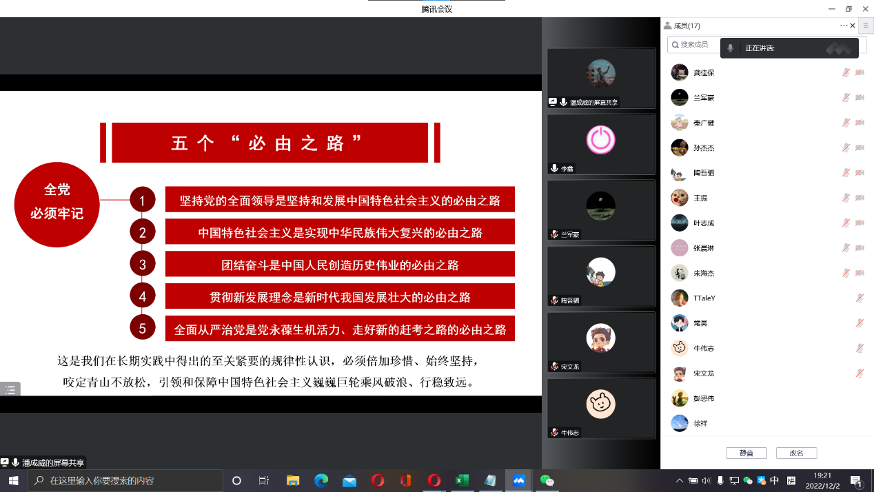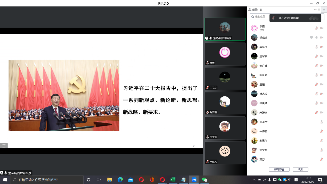会上,党支部书记潘成威对党的二十大报告中提出的一系列新观点、新论断、新思想进行了解读。他表示,支部全体党员要充分认识学习党的二十大精神的重要意义,切实把思想和行动统一到党的二十大精神上来,结合自身学习、工作,全面、准确把握党的二十大报告中提出的新观点、新论断、新思想,深刻领悟“两个确立”的决定性意义,增强“四个意识”、坚定“四个自信”、做到“两个维护”,自觉在政治上、思想上、行动上与以习近平同志为核心的党中央保持高度一致。