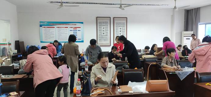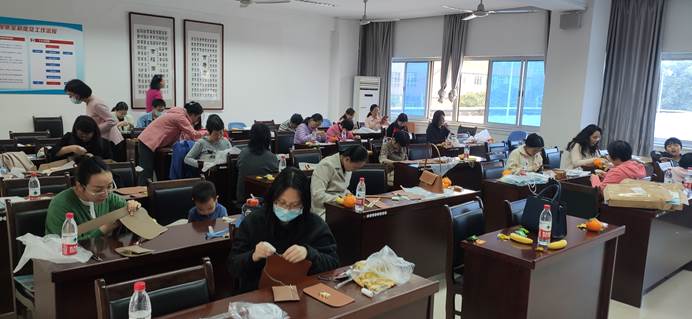 活动开始后,大家分别参加了不同组别的制作小组,每个小组都提供了不同风格、不同款式的手工包材质,各式材质、工具一应俱全,指导员进行了认真的讲解,大家拿到材质之后,随即坐下来进行了认真研究,手工包看似简单,到了真正动手缝制才发现要仔细研究、认真动脑才能做好。稍不留神就会出错,要么是弄错了程序,要么是漏掉了配件,要么是缝反了布料…….