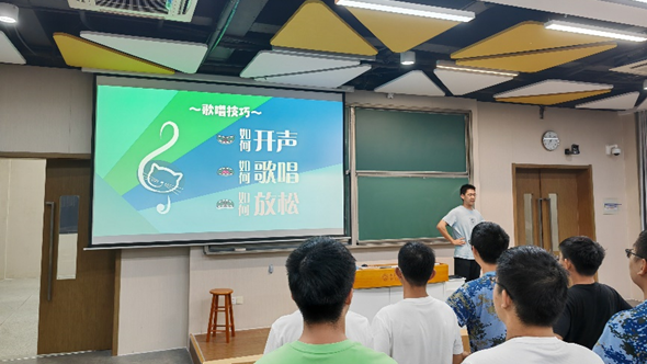 首先,李佳林同学从如何开声、歌唱、放松来介绍歌唱技巧,并用简单易懂的方式带同学们进行练习。之后,杨映川同学按照示范、逐句教唱、跟随伴奏原唱练习的流程进行教学,并伴有乐理知识的细致讲解。