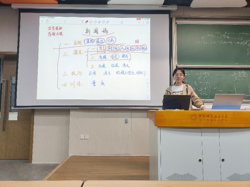 宣传委员张文歆同学通过视频和讲解的方式详细讲解了新闻稿的撰写格式、内容、注意点和word文档操作。她亲自演示了新闻稿调整格式的过程,使讲述更加生动形象。