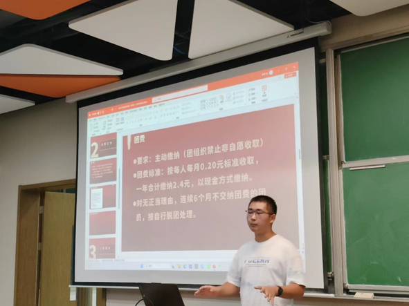 冯彦博同学说明了团费、青年大学习、优秀团员评选、入党等相关事宜,介绍了运动会开幕式方阵、观众席标识及宣传报道等工作的安排,通知了创建我校第四批“极客中心”、秋季学期社团美育课程、合肥滨湖国家森林公园2023年秋季学期劳动教育课程。同时他组织同学进行了入团候选人的投票。