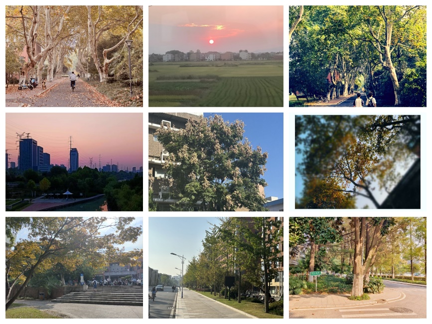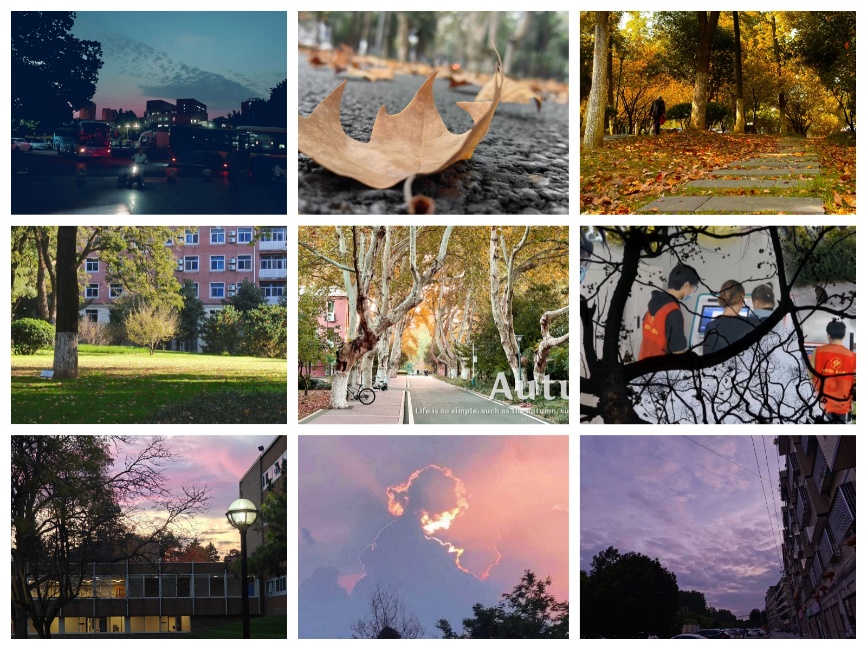 同学们在房杰同学的号召下,拿起手边的相机,记录下身边的秋天美景,并使用修图软件对照片进行调色,配以简短的文字,形成一幅幅别有意境的摄影作品。每位参赛同学需提交一张照片或其他类型的数字艺术作品,并备注创作思路。在同学们的作品中,秋天是"红叶黄花秋意晚"的唯美幽静,是"我言秋日胜春朝"的天朗气清,是"却是晓云闲"的优雅娴静,也是"明月如霜,好风如水"的清景无限……秋日的风光在同学们的镜头下大放异彩,每一缕秋风都带着动人的姿色。