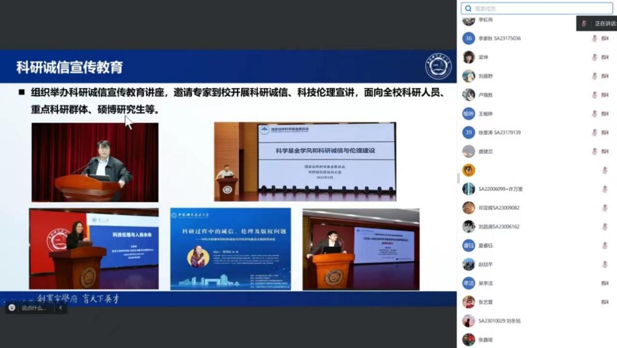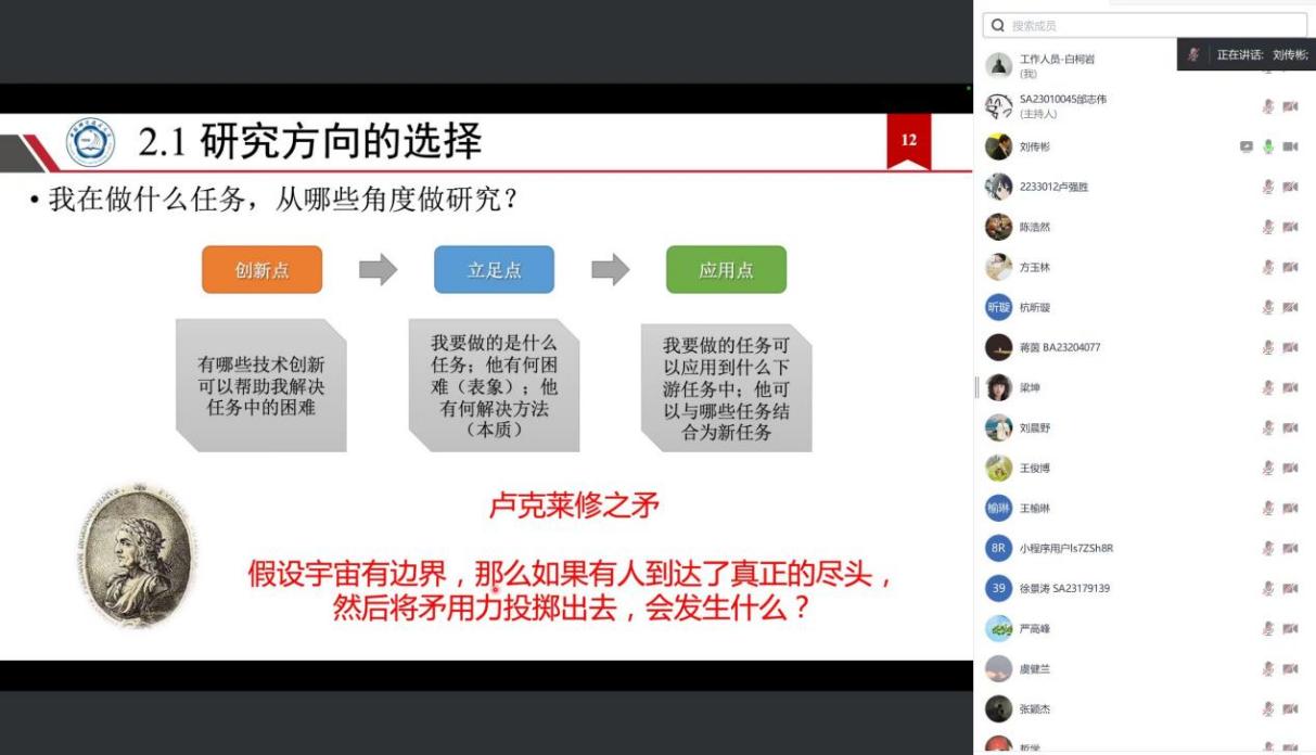 12月3日晚19:30 ,“研而有信”2023科研启航系列活动之科研思维与方法分享暨科研诚信讲座在腾讯会议平台线上举行。本次讲座邀请了信息科学技术KY.COM开元体育(中国)科技公司青年教师刘传彬、科研部学风与科研诚信建设办公室主管赵军分别针对科研思维与方法、科研诚信等为同学们作经验分享和政策规范介绍。