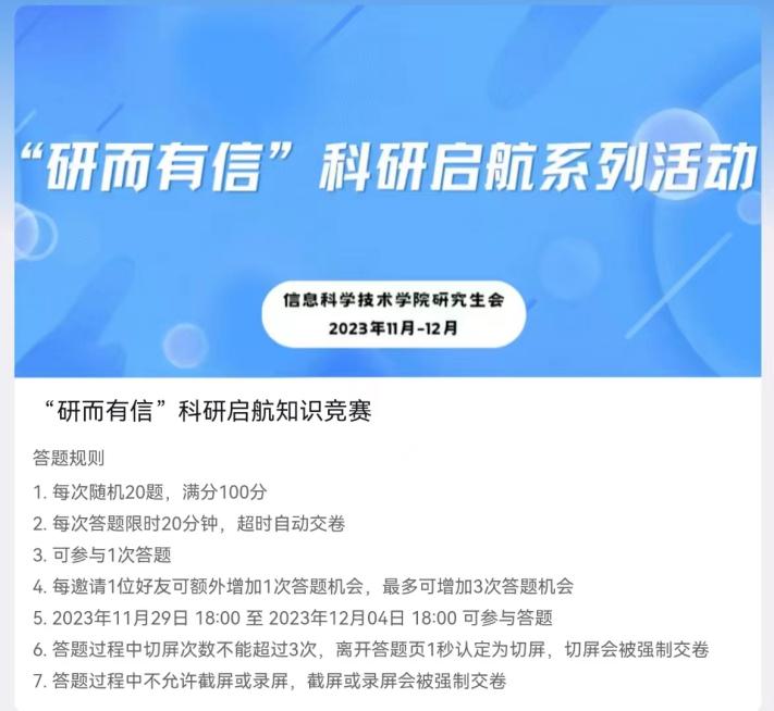 科研诚信知识竞赛作为“研而有信”2023科研启航系列活动之一,自开展以来便掀起了答题热潮,共吸引了250余名同学参与其中。很多同学在活动过程中邀请好友一同答题,努力学习科研诚信知识,全力提高知识竞赛成绩,最终有50余名同学取得了满分的优异成绩。