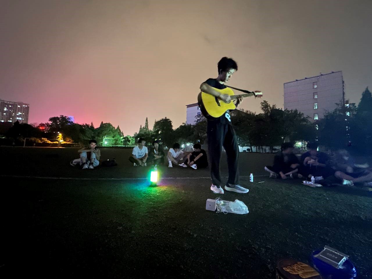 最后是同学们自发的才艺表演环节。有同学选择吉他弹唱,随着晚风的轻抚,琴弦被小心地拨动。乐声在静谧的月光下流淌,同学们十分享受这百忙的学习生活中难得的悠闲时光。还有同学选择伴着音乐为大家献上一支舞蹈,年轻的活力在律动之间无限挥洒,感染了一旁的同学们,摇起手臂为这位同学呐喊。