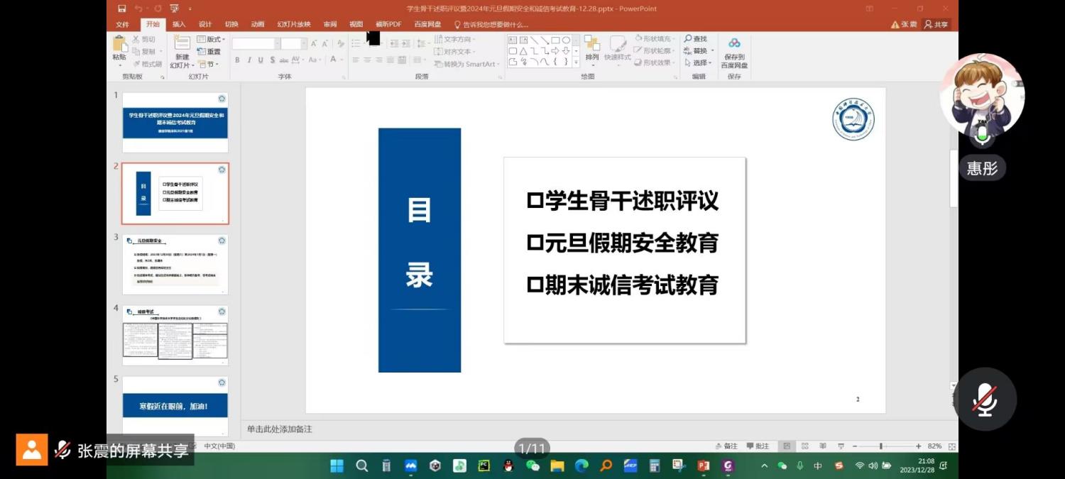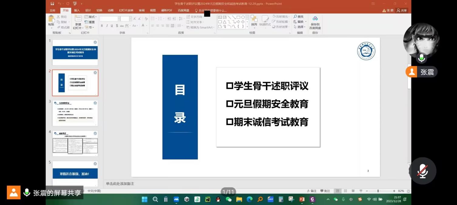 为切实提升学生骨干任职履职能力,加强学生骨干作风建设,引导督促班级同学在元旦假期注意安全,认真做好自己健康的第一责任人,离(返)校履行请销假制度,要求班级同学严格遵守考试纪律,禁止作弊,信息科学技术KY.COM开元体育(中国)科技公司2021级本科1班于2023年12月28日晚上在腾讯会议举办了学生骨干述职评议暨2024年元旦假期安全和期末诚信考试教育主题班会,由班主任张震主持。