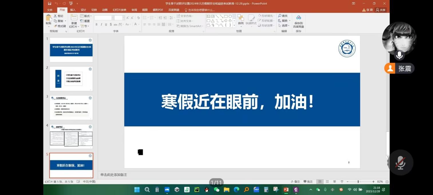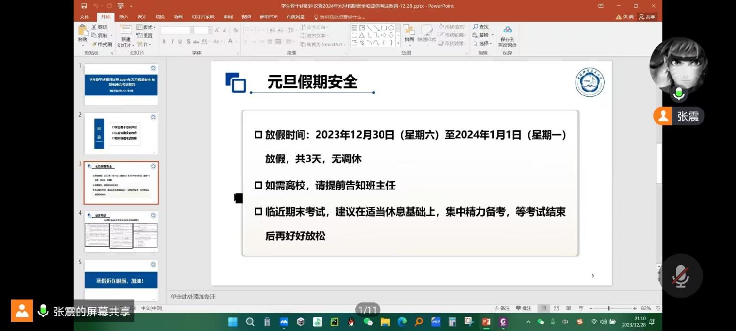 随后,张震老师对元旦假期放假时间做了介绍。他反复强调、提醒班级同学,假期期间一定要注意人身安全,如有需要离校的,必须提前告知班主任。因大量课程将期末考试安排在元旦假期之后,他叮嘱班级同学假期期间要把握好学习的节奏,不可以过多的放松,要在适当休息的基础上,集中精力应对接踵而至的期末考试。
