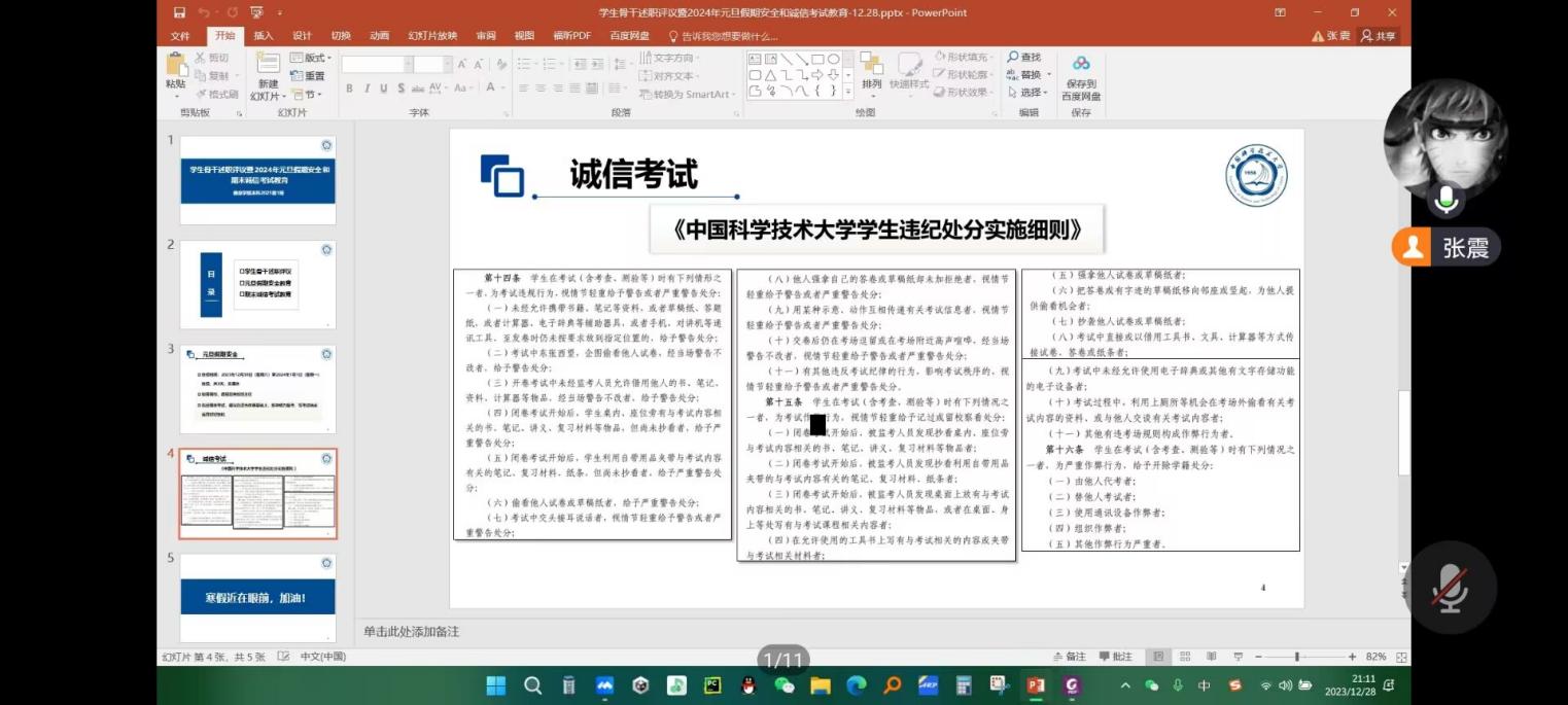 此外,张震老师再次向同学们强调了诚信考试的重要性。他指出,考试成绩不理想,后续还有补考、重修的机会,学校给大家再来一次的机会,完全可以通过自己的努力获得理想的成绩,但一旦违反了考试纪律,就是触碰了红线,轻则受到警告,重则可能面临开除学籍的严重后果。他强调,诚信是每个学生都应该具备的基本素质,同学们一定要严格遵守考试纪律,不要存在任何侥幸心理。为了帮助同学们更好地理解诚信考试的重要性,张震老师带领班级同学学习了《中国科学技术大学学生违纪处分实施细则》,用作弊受到惩罚同学的例子来警示大家,极个别同学在考试中耍小聪明违反考试纪律,不仅失去了获得理想成绩的机会,还破坏了自己的品德。