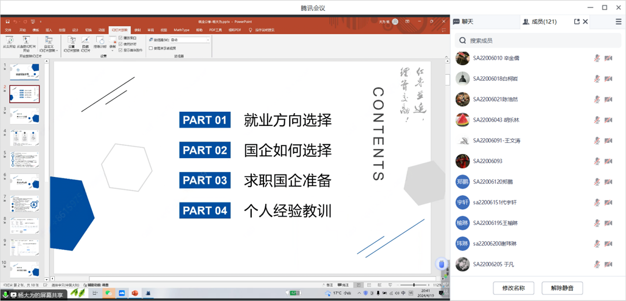 杨大为,10系电子信息专业2024届硕士毕业生,分享就业类型为国企。杨同学首先分享了关于就业方向选择的一些经验和建议,然后详细介绍了应该如何选择国企,随后对求职国企所需要的准备进行了讲解,详细介绍了不同类型的国企的特点、招聘时间、专业倾向以及笔试面试等信息,最后分享了个人的一些求职经验教训。