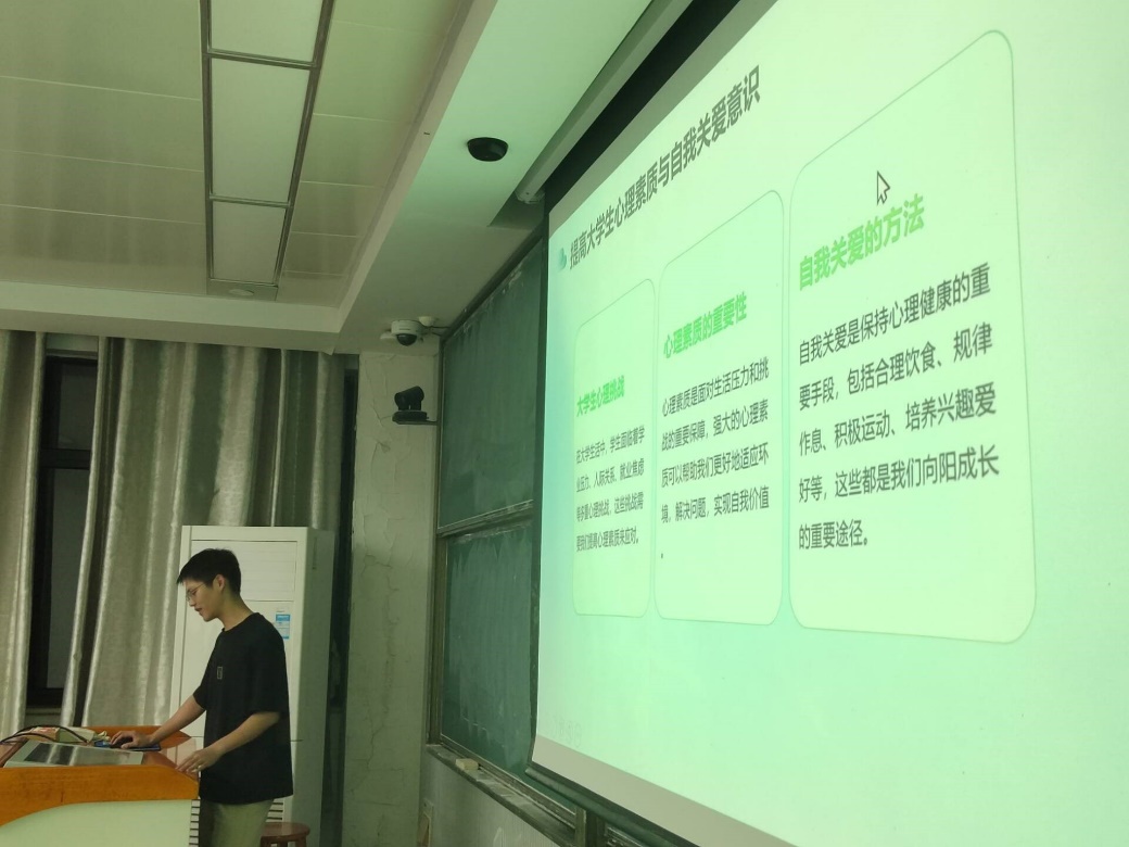 随后,心理委员祁川同学为同学们作心理健康知识分享。他讲述了心理健康问题在当代大学生中的普遍性以及其对学习和生活的潜在影响。他认为,学会如何保护心理健康是每位同学都需要深思的课题,并向同学们分享了多种缓解心理压力的方法,例如蝴蝶拍、与朋友交流心情、利用塔罗牌占卜娱乐等。