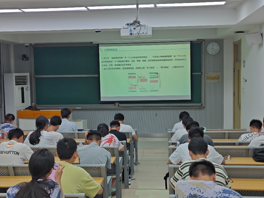 首先,按学校的统一安排,全班同学进行了心理测试。胡效鸣用PPT的形式向同学们说明了心理测试的账号登陆方式,随后安排同学们有序进行答题。