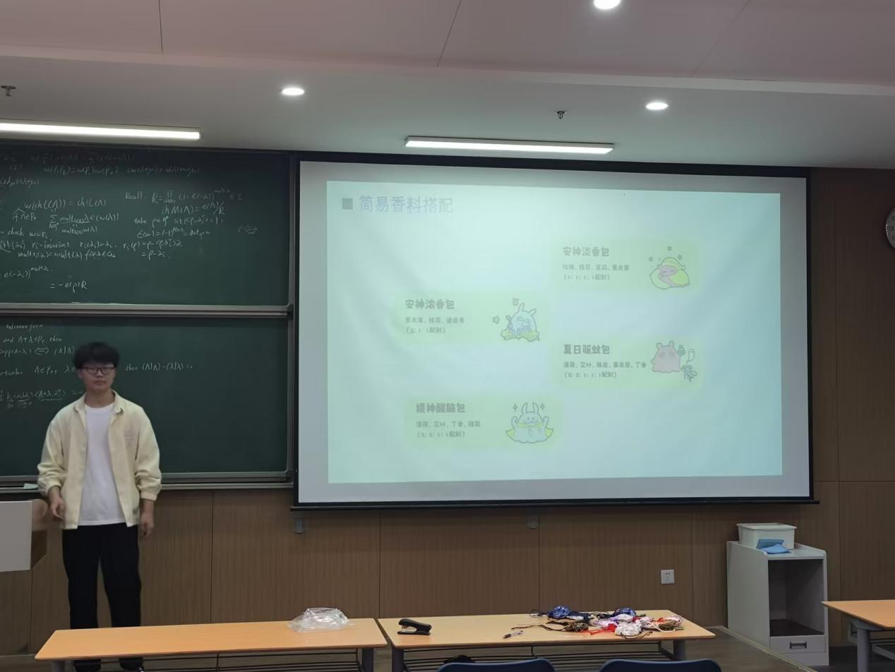 活动伊始,主持人通过生动形象的PPT,以专业的视角,向在场的同学们详细介绍了香囊的历史起源、文化内涵以及其在传统节日中的重要作用。通过深入浅出的讲解和生动的图片展示,使同学们对香囊有了更加全面而深刻的认识。接着主持人又为同学们详细介绍了香囊的制作方法,包括选材,配色等一系列技巧,并展示了几种经典的香料搭配方法,确保每一位同学都能掌握制作诀窍和方法。