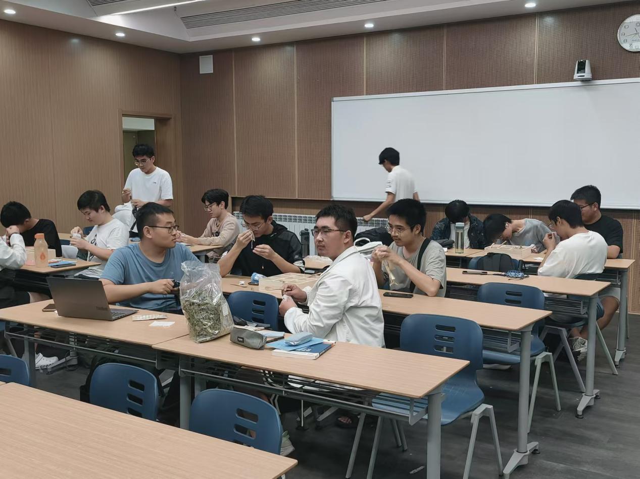 介绍完成后,主持人为同学们分发了制作材料。在充分了解制作流程后,同学们按照事先分配好的小组,开始自己动手制作香囊,现场洋溢着欢声笑语。主持人则在一旁耐心为同学们答疑解惑,提供指导。经过同学们的不懈努力,一只只形态各异,独具匠心的香囊展现在大家面前。这些香囊或精致典雅,或活泼可爱,无不展现着同学们的创造力。