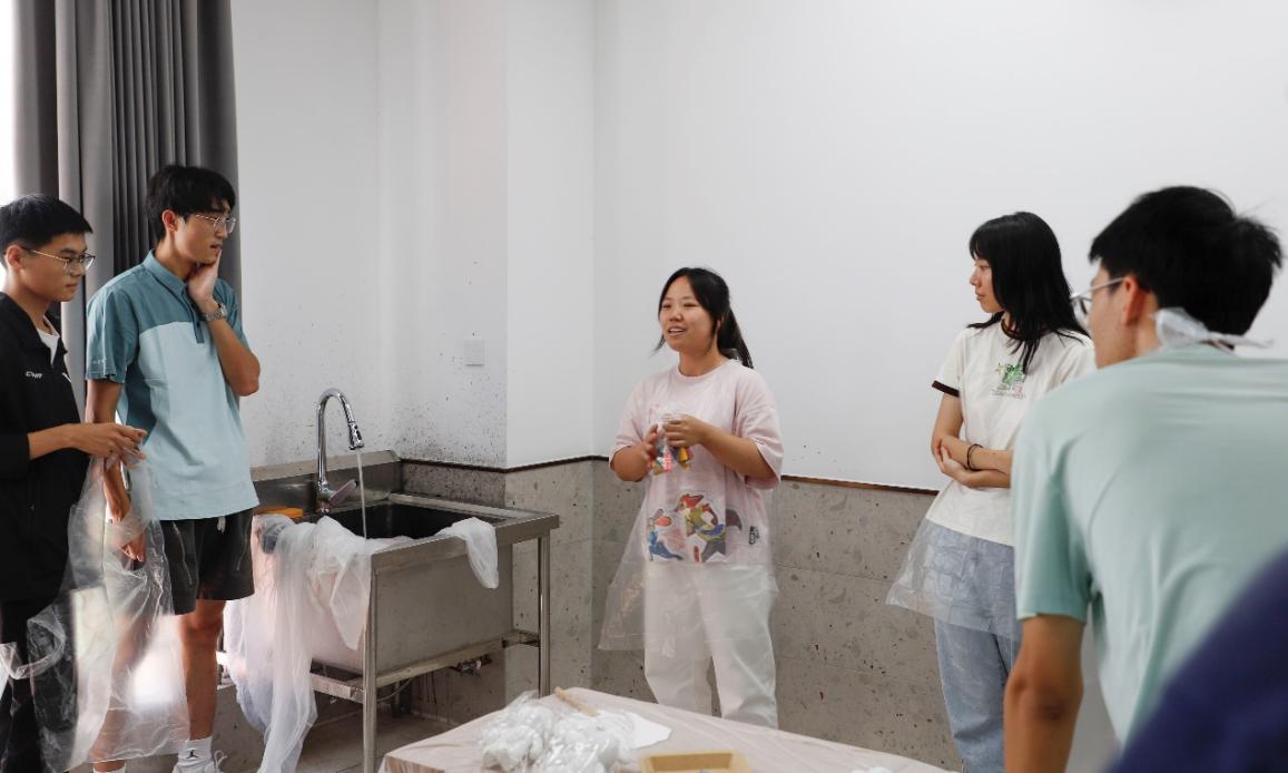 经过前期调研与调查,活动现场为同学们提供漆扇和流体熊原材料进行制作。在制作开始前,王艺榕同学对材料选择、制作流程、注意事项等方面一一为同学们作了讲解,并对制作流程进行了演示。