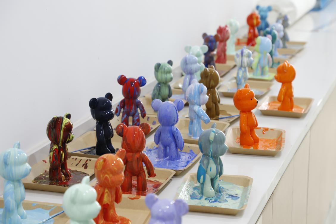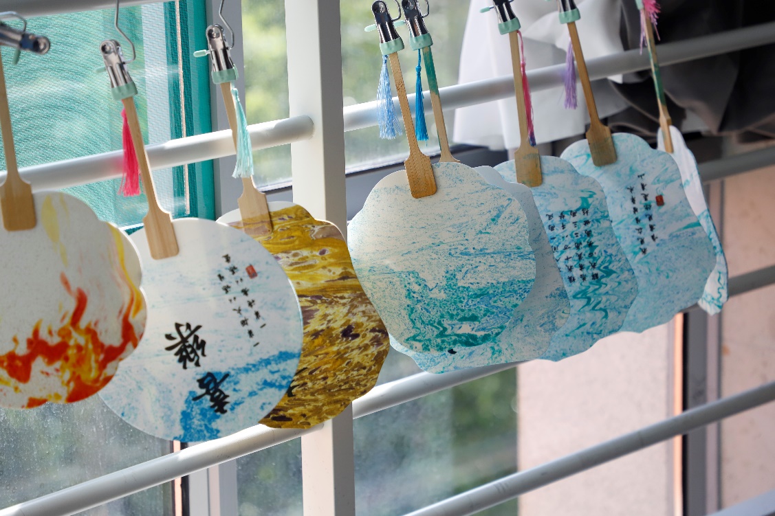 在制作过程中,同学们充分发挥创意和想象,不断尝试各种颜色搭配与上色技巧。制作出的漆扇和流体熊随颜料选择与上色时间的不同,呈现出丰富的色彩和各异的纹样。同学之间相互参考,互相帮助,共同交流,教室里充满了欢乐的气息。再经过一段时间的静置晾干,颜色或鲜艳活泼,或华丽酷炫,或内敛深沉的漆扇和流体熊便呈现在大家眼前。