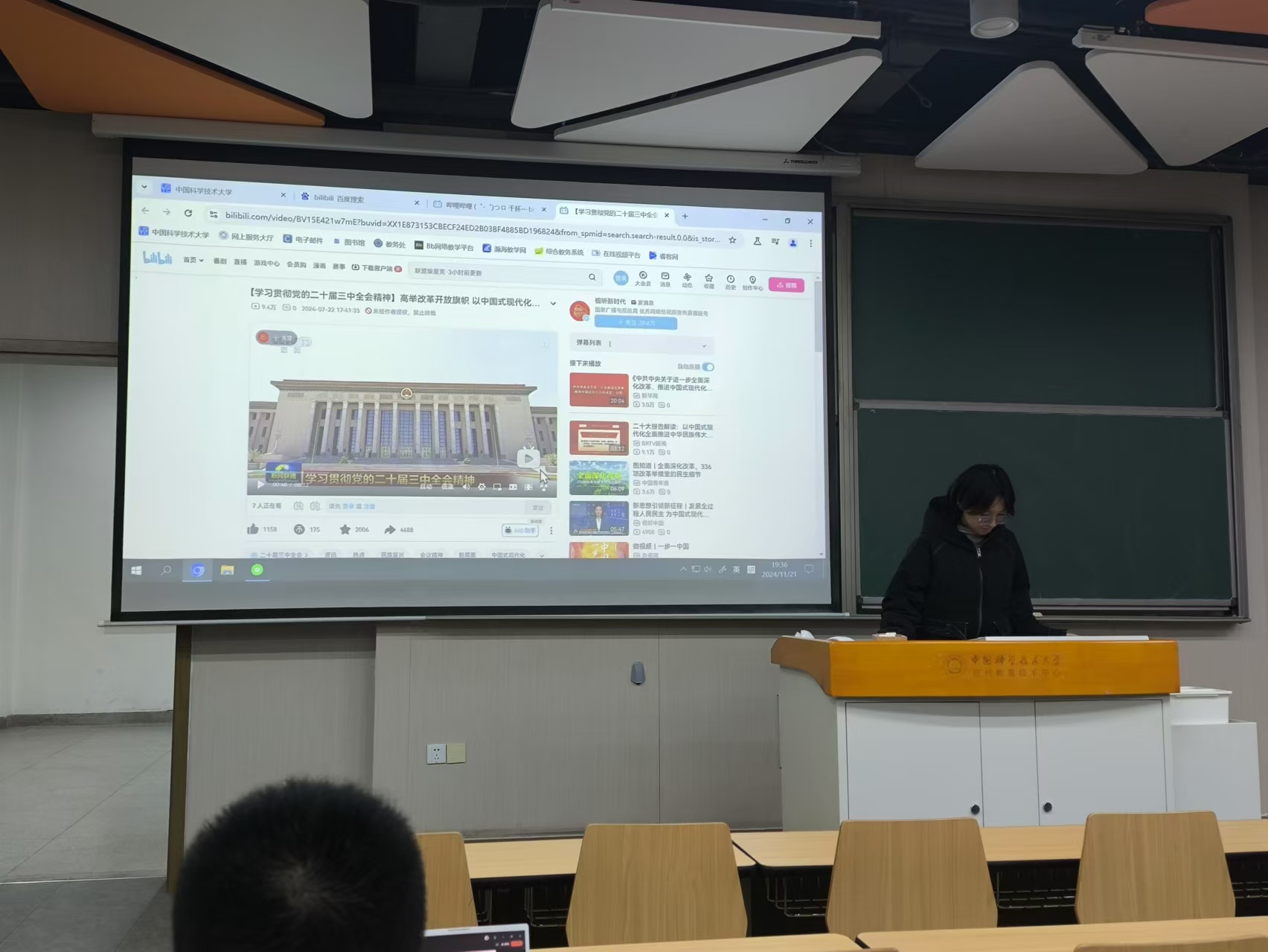 会议的序幕在主持人精心策划的安排下缓缓拉开。主持人选择了视频《学习贯彻党的二十届三中全会精神:凝心聚力抓落实 开创进一步全面深化改革新局面》作为会议的开场。视频中,国家重大政治决策的背景、意义以及实施过程被逐一展现。通过历史资料的穿插和专家的深入解读,同学们不仅对这些决策有了更加全面的认识,而且对其背后的深远影响和战略考量也有了更深刻的理解。