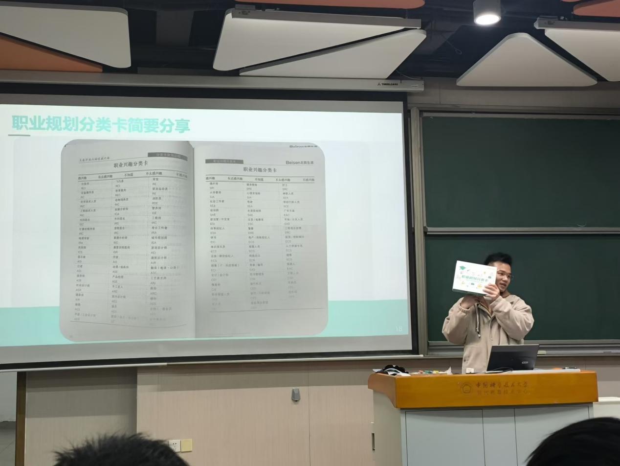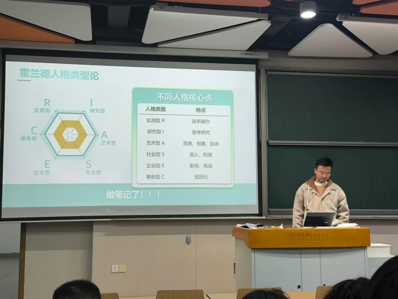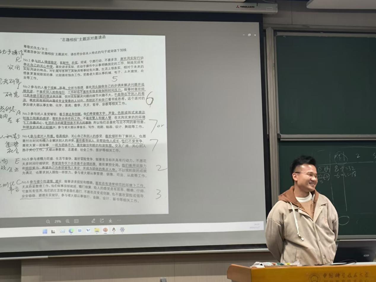 为了更好地帮助同学们了解自己的性格特点及职业倾向,从而更有效地规划未来,瞿梓俊老师向学生们介绍了MBTI人格理论和霍兰德人格类型论等工具。通过引导大家进行测试,了解自己的性格特征,并基于此展开对适合职业的思考。例如,老师在课堂上开展“志趣相投主题排队邀请函”活动,鼓励学生们反思自己的性格特质,并将其与霍兰德模型中的六种人格类型对比匹配,找到最适合自己的发展方向。