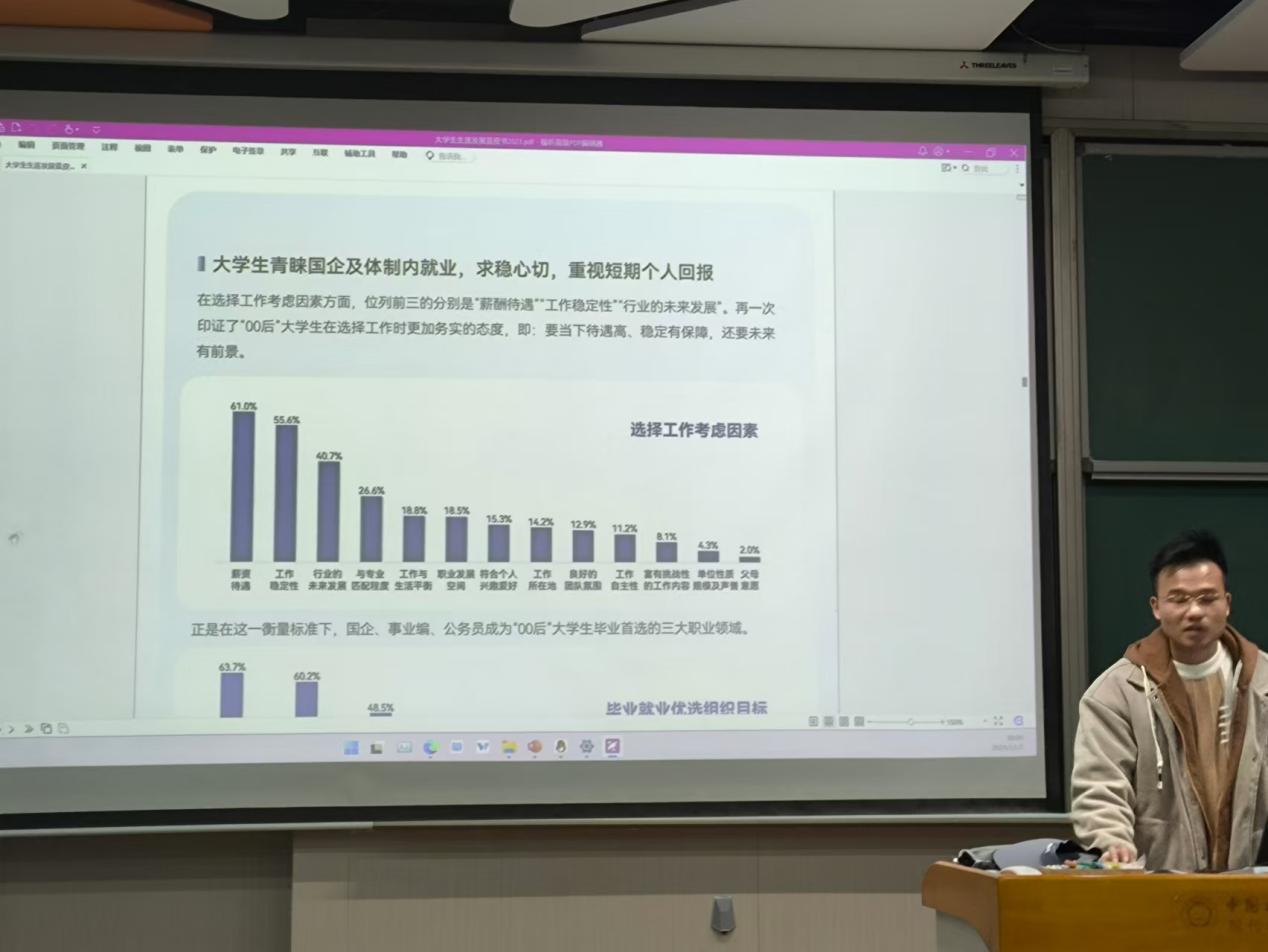 在此基础上,瞿梓俊老师以《2023年大学生生涯发展蓝皮书》为基础,详细阐述了当前大学生对于职业生涯的认识与规划的现状。其中,数据显示,随着时间推移,有清晰职业规划的大学生比例逐渐下降,这一现象引发了学生们的深思,使他们更加直观地认识到学会规划自己职业生涯的重要性。