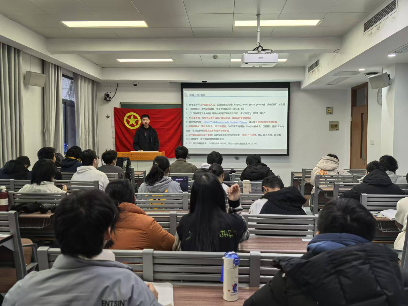 会上,胡效鸣首先就近期的注意事项向同学们进行了工作提醒。他指出,要留意时间节点、按时完成“军事理论”课程的线上考试和“大学生国家安全教育”的视频学习,要提前查看期末考试安排、合理规划寒假返家行程,学有余力的同学可以积极申请学术实践基金和庆峰杯等赛事,为自己的学术生涯打下坚实的基础。