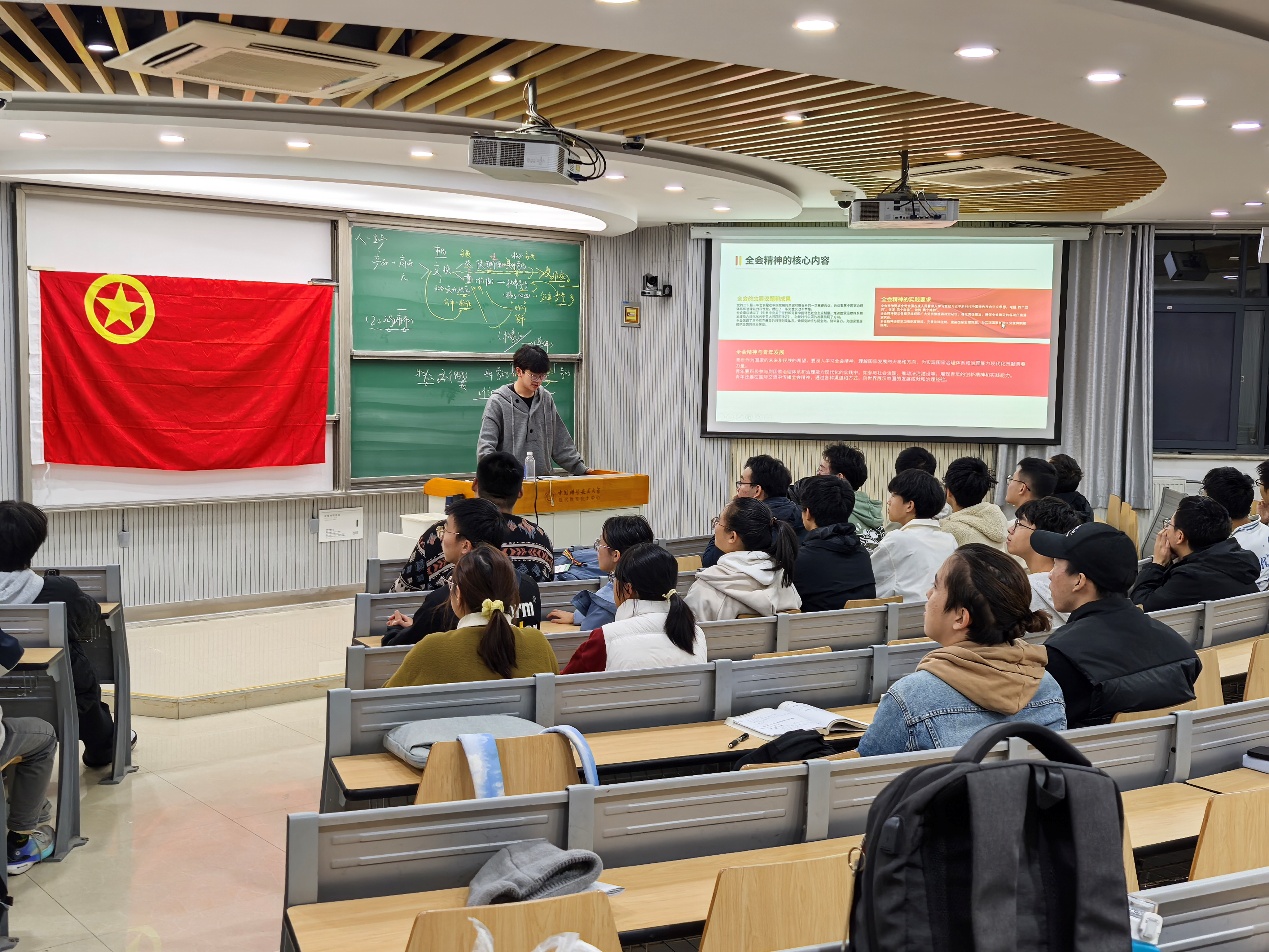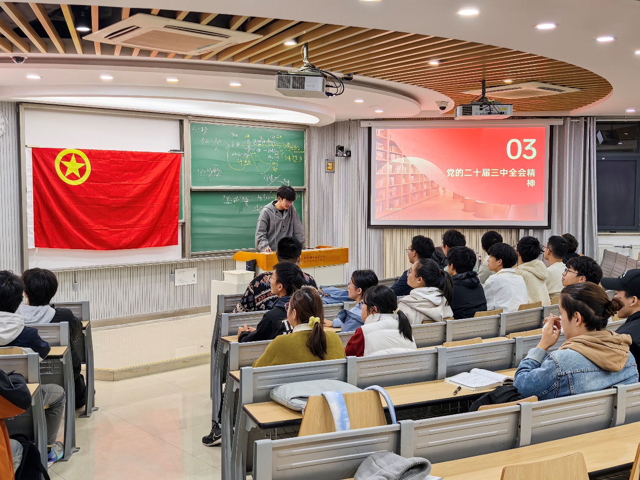 班级团支部书胡泽豪带领全体团员深入学习党的二十届三中全会报告和《党章》,延伸阅读《辅导读本》、《辅导百问》等材料,深刻体会了大会精神和战略安排以及与个人职业领域相关的重大论断,激发要有岗位建功的持久动力。