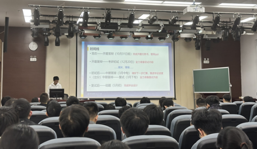 在学长分享环节,2021级三位优秀毕业论文获得者结合自身经历,向同学们传授了宝贵经验。人工智能专业的卢星宇同学介绍了论文撰写、PPT制作及答辩准备的技巧,分享了在选题与汇报过程中遇到的困难与解决方法。他建议同学们在初期重视选题方向,多与导师和师兄师姐沟通,选择符合自身兴趣与能力的课题。他强调,合理的选题是成功的关键,只有找到真正感兴趣的方向,才能在研究中保持专注与热情。