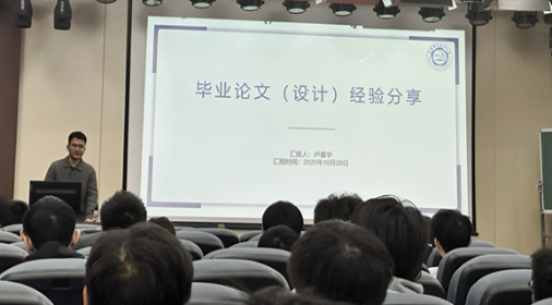 自动化专业的陈卫星同学结合自身获得校优毕业设计的经历,围绕选题、实验与答辩三个环节进行了讲解。他展示了从前期学习UR5机械臂控制、需求调研,到后期平台搭建、数据采集与分析的完整时间线,结构清晰、衔接紧密。陈同学指出,毕业设计应选择题目适中、具有研究深度且符合自身能力范围的方向,既体现创新性,又避免超出操作能力。他提醒同学们,实验数据与图表制作往往耗时较长,应尽早规划并尽快完成实验阶段,为后续分析和答辩留足时间。