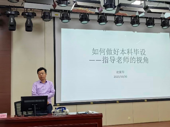 活动伊始,凌震华副院长从指导教师的视角出发,阐述了毕业设计在本科培养体系中的重要地位。他指出,毕业设计的核心意义在于“学以致用”,是连接理论与实践的关键环节。只有真正认识到毕业设计的价值,学生才能以积极的态度投入其中,将其视为一次系统的科研训练与能力提升过程。凌老师强调,同学们应在理解这一意义的基础上,带着问题意识和创新精神开展研究,在选题中结合个人兴趣与专业方向,在实践中培养独立思考与动手能力。同时,他提醒大家注重与导师的沟通,保持科研诚信,严格遵守论文质量标准。最后,他鼓励同学们以毕业设计为契机,主动探索、勇于创新,在实践中实现从知识学习到独立研究的跨越。