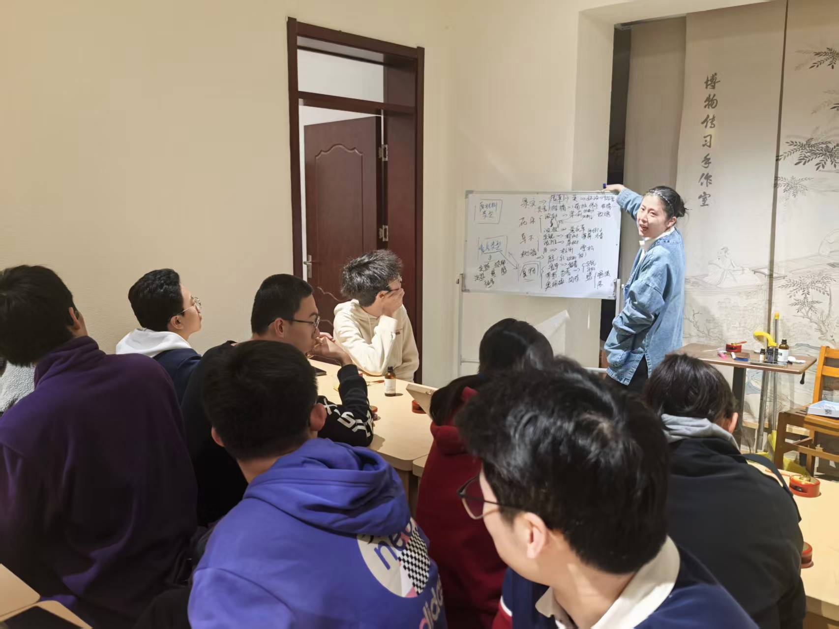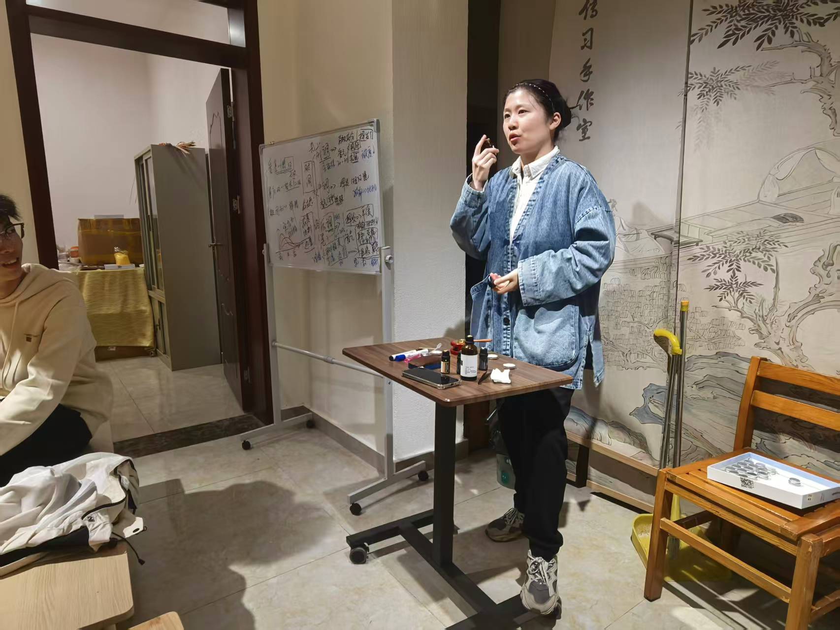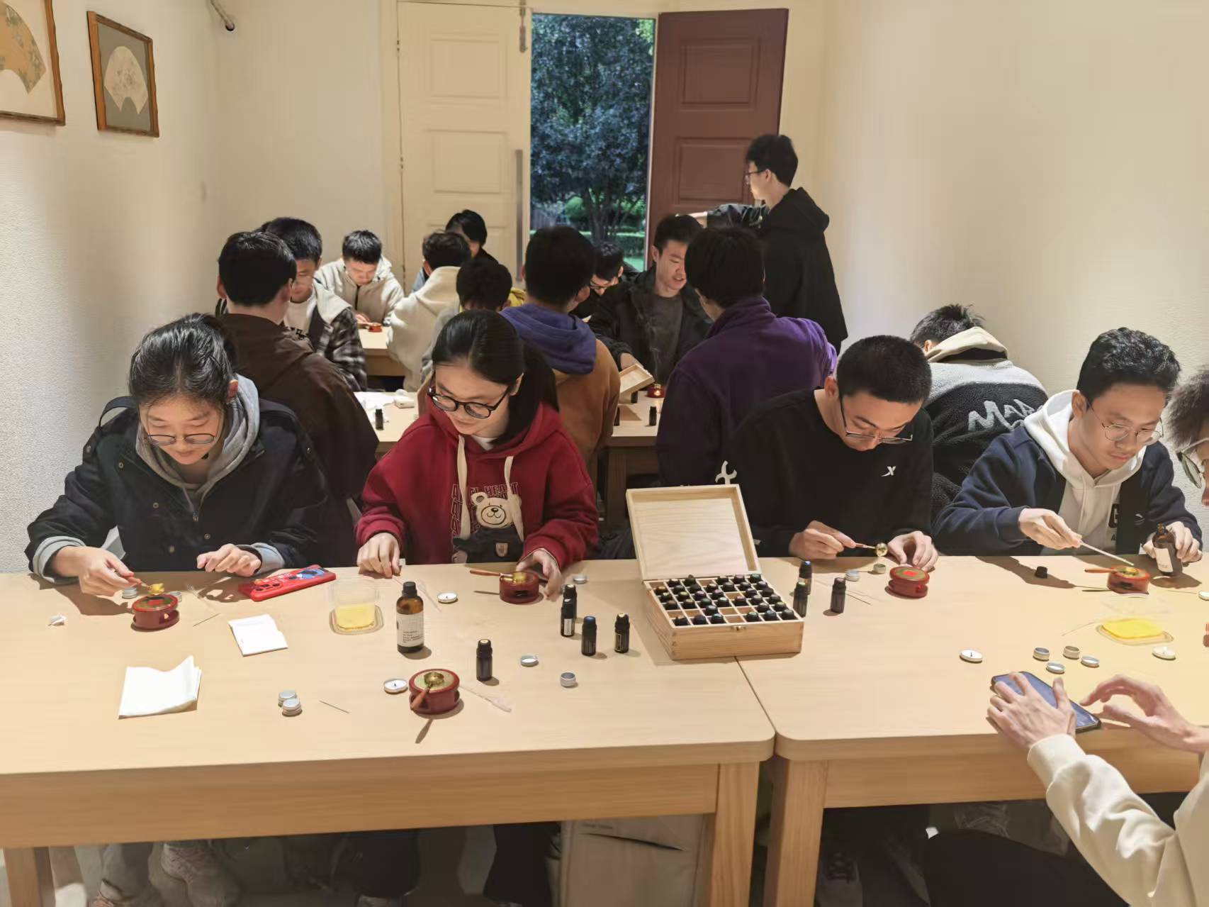在实践环节,同学们兴致勃勃地检查了制作工具和材料:甜杏仁油、多种精油、蜡烛、胶头滴管、搅拌工具等一应俱全。老师现场演示了香膏制作的全过程,从精油配比到加热搅拌,每个步骤都细致讲解,同时强调了操作中的安全注意事项,鼓励同学们在遵循传统工艺的基础上大胆创新。