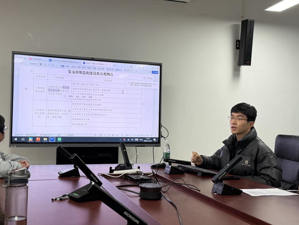 随后,院党委办公室李海鑫对党支部规范化建设重点观测点进行了深入解读。他结合上一年度党支部考核工作通知内容和2025年基层党建“互查互评、互学互促”工作情况,特别强调要注重支部工作过程性材料的真实性和完整性,确保党建工作与业务工作深度融合、同频共振。